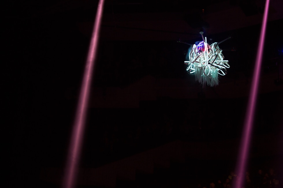 Drones were personalised with everyday objects such as artificial nails, keychains, stuffed toys, feathers and electroluminescent tape. Each was designed with a unique character and behaviour in mind. Some held speakers to amplify their own sound as musical performers, and others were self illuminated or delivered special effects such as glitter bombs and contrails of smoke.